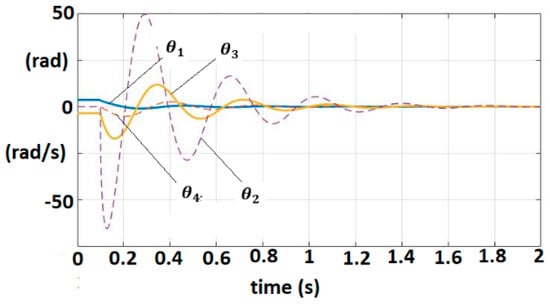 The delay component of the dynamic model is defined by The controller parameters are selected as that satisfy Equations (29)–(31) by employing the same parameters for as in the previous example. The evolution of the fractional order variables is shown in Figure 9.