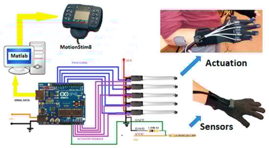 The mechanical architecture consists of articulated serial elements of which design covers functional and anatomic finger phalanges. The glove is created by a thin textile that represents an infrastructure suitable for actuation wires and sensors. A distributed actuation system is used for implementing the operations of the hand. An Arduino Flex Sensor network (with zeroth order sensors) is used to control the motions. An Arduino Mega 2560 hardware platform determines the movement of the glove’s actuators for exercises like opening or closing of the fingers (Figure 11 and Figure 12).