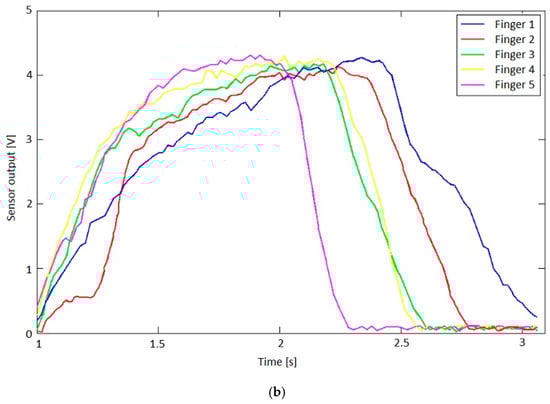 All the movements of the hand are controlled by the software of the hybrid IHRG system, which was developed in MATLAB and Simulink. The performance of each patient following the exercises program can be recorded by the same software. The control system of Control System 1 is implemented. In Figure 13 are shown the sensor signals during an open-close-open hand exercise.