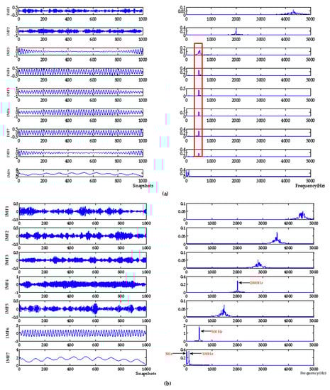 - Power spectrum entropy (PSE) can reflect the variation characteristics of the frequency in the signal. In the whale-optimization algorithm, PSE is used as the fitness function, and it is easier to find the optimal parameters , which can improve the accuracy of signal decomposition. There is no modal aliasing when decomposing the signal using the algorithm proposed in this paper.