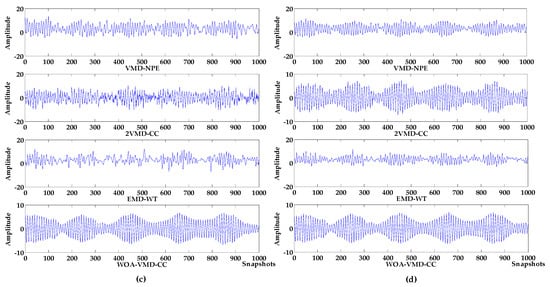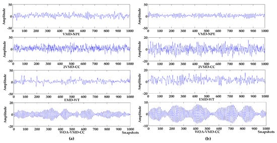 The denoising results of WOA-VMD-NPE and WOA-2VMD-CC. (a) WOA-VMD-NPE; (b) WOA-2VMD-CC.