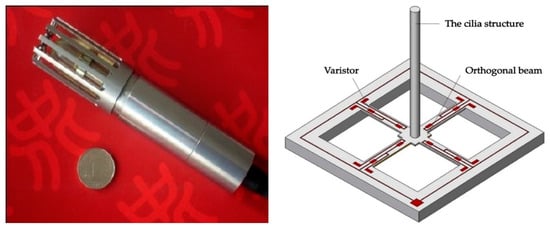 The hydrophone used in the experiments is a MEMS vector hydrophone produced by North University of China [40]. The basic structure of the hydrophone is shown in Figure 10. The cilia vibration caused by sound wave propagation produces the stress, which deforms the root of the cross beam micro-structure. The resistance of the varistor integrated at the root of the cross beam is changed. Then the resistance change of X-axis, Y-axis are transferred to voltages, and measured by Wheatstone bridge. Following the principle, the underwater sound signal is converted into the electrical signal.