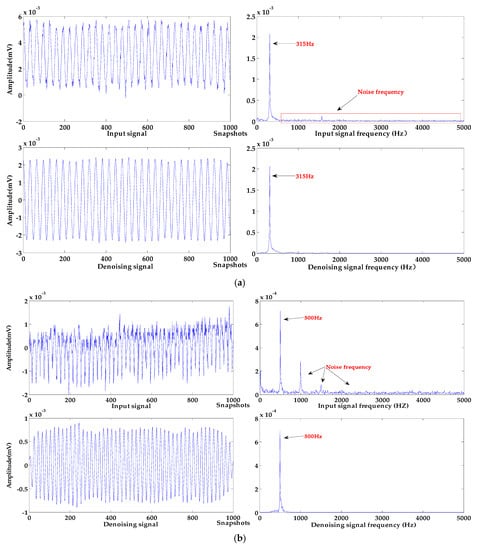 These input signals are processed by the algorithm proposed in this paper; the baseline of each denoised signal has been effectively corrected to the zero level, and the baseline drift for different trends have been removed. In terms of denoising effect, the noise of all input signals is effectively removed. The input signal with a frequency of 315 Hz has a few high-frequency noises, the signal waveform after denoising is smoother, and the denoising effect is the best. After denoising the input signals with frequencies of 500 Hz and 800 Hz, the amplitude of the denoising signal is stable, which retains the basic characteristics of the sound source signal. It can be seen from the spectrograms that the high-frequency noises are effectively removed and the energy of denoised signals are not reduced.