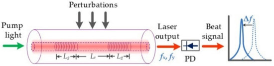 A fiber laser with a short cavity and orthogonally polarized mode emits monochromatic light. Once an ultrasonic wave exerts pressure on the radial direction of the fiber laser cavity, the resonant frequencies of the two polarized modes change differently, and thus the beat frequency varies with ultrasonic pressure. A schematic of the dual-polarization fiber laser sensor is shown in Figure 1. The sensor was fabricated with an Er/Yd co-doped fiber (Er/Yb codoped fiber, EY305, CorActive, Canada). We photo-inscribed two wavelength-matched, highly reflective intracore Bragg gratings in the fiber core to form a resonant cavity. A 193 nm ArF excimer laser with a 1059 nm pitch phase mask was used to fabricate above gratings of length Lg and grating separation Ls. The two gratings and the gain medium between them formed the Fabry–Perot cavity of the fiber laser. To ensure the single longitude mode operation, the grating separation Ls was typically less than 1 cm. Fiber absorption of the pump wavelength (980 nm) was ~1337 dB/m, which offered high gain to the fiber laser. Each grating had a coupling strength of ~25 dB, providing strong optical reflectivity. The length of one grating Lg was 3.0 mm. After fabricating the gratings, the annealing process of the fiber laser was performed for 120 min at 120 °C to reduce the photon darkening effect induced by UV exposure.