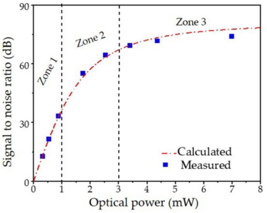 where B is the measurement bandwidth, is the RF signal power, and k0 is the photon-to-electron conversion efficiency [48,49]. Using measurement data in Figure 4, the coefficients in Equations (3,4) are calculated as k1 = 5.8 × 10−14, k2 = 7.8 × 10−14, k3 = 1.6 × 10−17, k4 = 1.6 × 10−20, and k5 = 5.54 × 10−19. Both thermal noise and shot noise at 1 mW are −177 dBc/Hz. From k1, the noise of the fiber laser sensor is −145dBc/Hz, and the noise of the EDFA is ~6 dB. The fitted SNR curve is plotted as a dashed-dot line in Figure 4. In Zone 1, where we have low optical power (Popt < 1 mW) on the photodetector, the SNR is mainly limited by thermal noise and is almost proportional to Popt. In Zone 2 (1 mW < Popt < 3 mW), shot noise is the dominant noise source. The SNR is approximately proportional to Popt1/2. When further increasing the optical power, both thermal and shot noises become less significant, and the SNR becomes stable (labeled as ‘Zone 3’). When the input power exceeds the saturation power of the photodetector, the SNR may decrease due to reduced photodetector efficiency (k0 in Equation (4)).