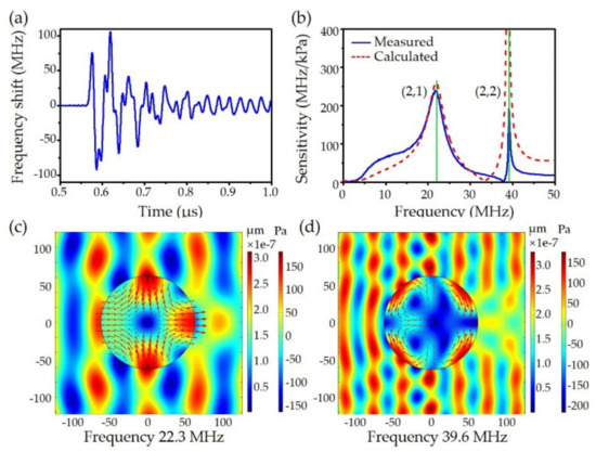 Frequency response of the fiber laser ultrasound sensor. (a) Transient response to a pulsed plane wave; (b) measured and calculated frequency responses; and (c) and (d) calculated displacement of the excited fiber vibration at the (2, 1) and (2, 2) modes.