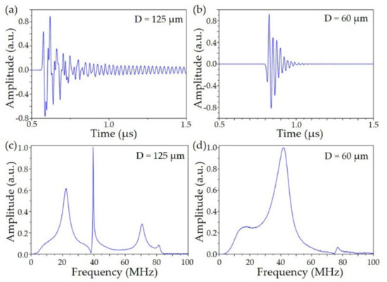 Transient response to a pulsed planar wave with different fiber diameter. Time domain responses of the 125 μm (a) and 60 μm (b) fiber sensor. Frequency responses of the 125 μm (c) and 60 μm (d) fiber sensor.