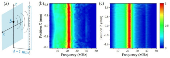 Figure 8 shows the measured frequency response of the fiber laser sensor. The acoustic source is located in the plane at a distance of d = 1 mm from the sensor, as shown in Figure 8a. Based on Equation (14), the frequency response decides on the product . The effective length Leq remains unchanged for the same distance but different lateral positions. In the x direction, the fiber laser sensor works as a point detector, which also shows a nearly flatten frequency respond with the acoustic source at different positions. As shown in Figure 8c, the measured frequency responses along the z axis are unchanged. In addition, the variation of the amplitude at the peak frequency of 39 MHz comes from the increased loss at further distance.