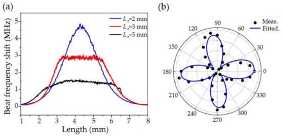 When the acoustic pressure is along the principal axis, the induced birefringence variation can be maximized. At 45°, the acoustic pressure induces nearly equal phase changes for both polarization modes, thus the beat signal produces nearly zero frequency shift. Figure 9b shows the azimuthal transformation of the fiber sensitivity. It was measured by the sensor rotating at 10° per step, maintaining a fixed acoustic point source. The angular response exhibits a |cos(2θ)| profile, which offers a 60° full angle at half maximum along this direction.