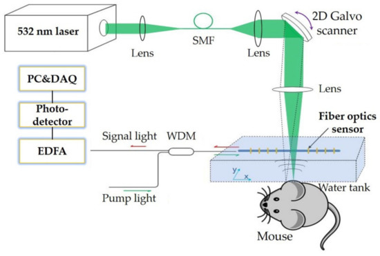 The optical resolution photoacoustic microscopy (OR-PAM) experimental setup, based on the fiber laser sensor. SMF: single mode fiber; WDM: wavelength-division multiplexer; EDFA: erbium-doped fiber amplifier; DAQ: data acquisition. Figure adapted with permission from Ref. [44].