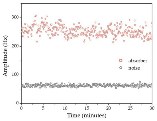 To quantify the lateral resolution of the OR-PAM system, a sharp blade edge was linearly scanned with a step size of 0.18 μm. The lateral resolution was measured as 3.20 μm. To validate its imaging field of view (FOV), the Galvo mirror controlled laser beam was raster-scanned over a black tape with spatially uniform absorption. The fiber laser sensor was fixed 1.60 mm above it. The restored maximum intensity projection (MIP) image was over 3 × 3 mm2, and the −6 dB FOV was calibrated as ~3 × 1.6 mm2. The penetration depth of the photoacoustic microscopy (PAM) was estimated to be ~800 μm in the phantom experiment and ~200 μm for the in vivo imaging [43,44,45], as determined by the numerical aperture and laser wavelength. To test the sensor’s stability, two human hairs were imaged in B-scan mode over 30 min. The peak to peak amplitude of the PA signal is shown in Figure 11. No noticeable noise variation of the sensor was observed. In a previous report [43], the fiber laser sensor remained stable while the sensor was scanned at ~10 mm/s in water due to the heterodyning detection.