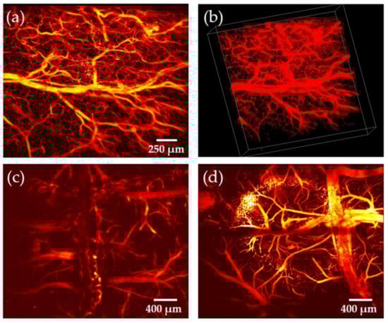In vivo experiments on the mouse ear and brain were conducted to demonstrate the setup’s imaging capability. Here, the laser pulse repetition rate was 100 kHz and the scanning rate along the slow and fast axis were 0.2 and 100 Hz, respectively. It took 5 seconds to capture a 3D image. The laser pulse energy on the tissue surface was 300 nJ and the imaging FOV was ~2 × 2 mm2. Figure 12a,b exhibits the MIP and 3D images of the mouse ear, where both trunk vessels and capillaries can be resolved clearly in the PA microscopic image. The restored mouse brain images with and without skull are presented in Figure 12c,d, where certain amounts of capillaries become much clearer without the skull. Therefore, the fiber laser sensor exhibited excellent performance in OR-PAM, being able to detect PA signals with great stability and high sensitivity.