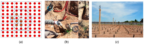 A network of soil sensors was installed in each of the four sampling plots to monitor soil temperature and soil moisture every 30 min at two depths (20 and 40 cm). Capacitance-based soil moisture and soil temperature monitoring sensors were used in our study [19]. The soil sensors measured the frequency units of the capacitance (SUF) circuit generated by the electrodes of a probe. The scale frequency was converted to volumetric water content in the soil, expressed as a percentage. This conversion required a calibration process that depended on soil properties, among other factors [20]. The calibration process is detailed explained in Appendix B. To collect the information, we used ADDIT S4 data loggers connected to a hub of communications that collected and sent data to a local micro-meteorological station placed within the study area. The station also collected independent data. Overall, 64 sensors were installed surrounding the center of each sampling plot (Figure 2). The correlation between sensed information and climatic variables needed to be accounted for when interpreting sensor measurements. For that purpose, a micro-climate station was installed in the center of the experiment. The station recorded the following variables of interest: temperature (°C), precipitation (mm), relative humidity (RH, %) and wind speed (Km h−1). In this way, sensor measurements could be associated in real time to the observed conditions.