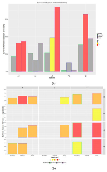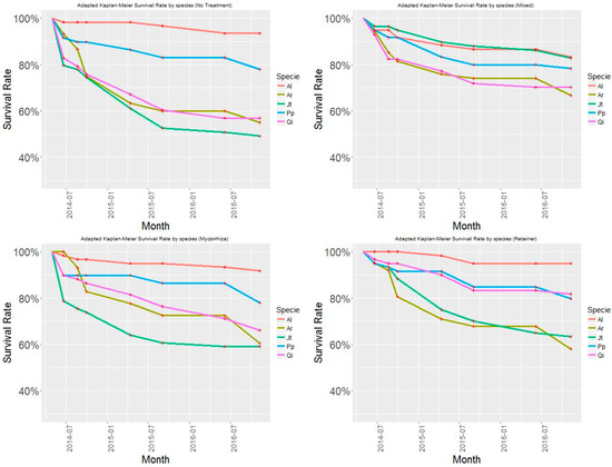 Our main interest was to evaluate the effect of treatments on the survival chance of individuals. The survival probability was computed for each individual every time a new field observation was available. For this purpose, we applied the approach presented by Cox in [28], which accounts for the change in individual survival probabilities (Equation (1)) using an array of factors (Equation (2)). In this study, we accounted for the influence of treatments and species.