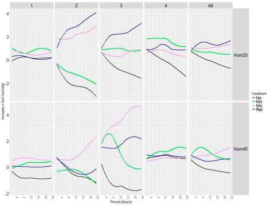 The positive effect of treatments to increase rainfall retention was assessed at two depths (Figure 6). The increment in moisture content at the 20 cm depth due to rainfall retention started to be significant (p value < 0.05) in all cases after 12 h from the rainfall episode. For the case of Retainer, the effect was already significant after 6 h. The effect of treatments was substantially lower at the 40 cm depth: model coefficients were only significant for the Mixed treatment and just after 18 h. We computed the difference (change) in the dependent variables (moisture at 20 cm and 40 cm) depending on the treatments for a rainfall of 10 mm in the n month period after a registered rainfall. Due to the complexity of the model, a graphical representation of the results can both better assess the effect of treatments and show the alternative infiltration patterns across the experimental design (Figure 6). The positive increment in moisture lasted longer and progressively increased for Mixed and Retainer, while the opposite behavior was observed in the Mycorrhiza treatment. When the results were downscaled and spatially displayed (i.e., for each sampling plot), we observed substantial variation in rainfall retention and in the way it progressed. The use of retainers was the most effective alternative to increase soil moisture content at the 20 cm depth in all plots while the Mixed treatment was the most significant at the 40 cm depth for Plot #2 and Plot #3.