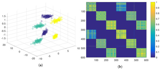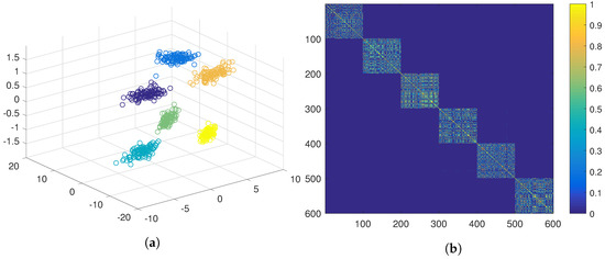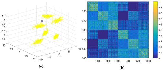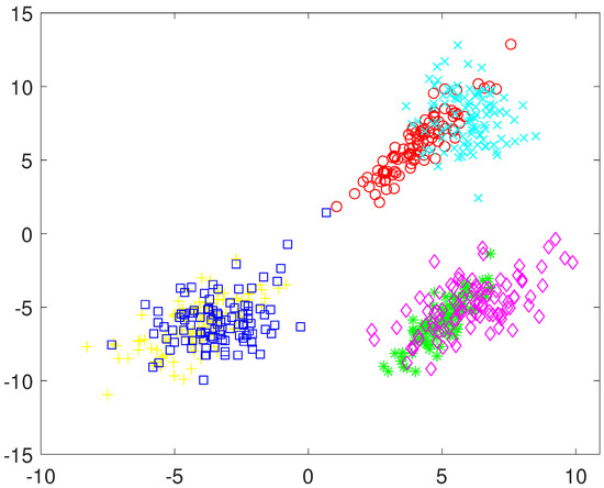 Figure 3, and the last feature is a Gaussian with mean of −1 for three clusters and another Gaussian with mean 1 for the other three clusters. A three-dimensional representation of the data can be seen in