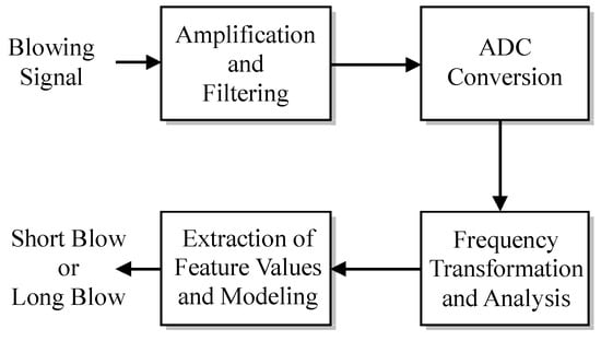 27]. However, it is necessary to transform the blowing signal to the frequency domain by using a fast Fourier transform (FFT), then analyze and extract the feature values, and finally establish the models to determine whether the blow is long or short. The whole process shown in