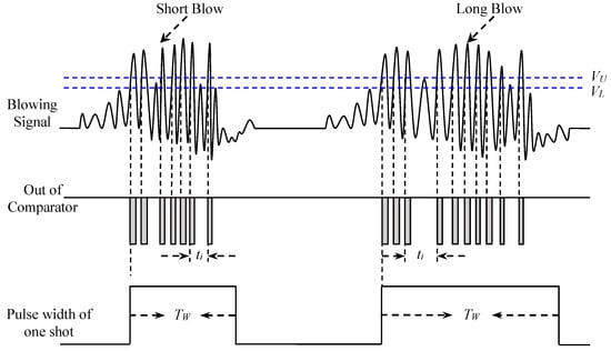 Figure 11a,b shows the waveforms corresponding to the short blow and long blow, respectively.