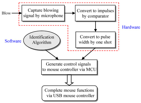 Figure 10 illustrates the implementation procedure of the hardware and software of the proposed blowing-controlled mouse. First, the blowing signal processing was realized in the hardware circuit, which included using the microphone to capture the blowing signal, converting the blowing signal into the corresponding impulses through the hysteresis comparator, and using a re-triggerable one shot to convert the impulses into the corresponding pulse width. To reduce the mutual interference of all the microphones, an identification algorithm to find the maximum blowing pulse width was executed by the MCU. After the identification, the MCU generated the control signals that were sent to the USB mouse controller such as coordinate pulses or the inputs of mouse buttons. Finally, the mouse controller chip directly communicated with the computer via the USB protocol and performed all the mouse functions.