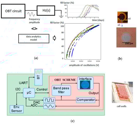 Oscillation-based technique and data-analytics model. (a) The oscillation-based technique (OBT) circuit is connected to the Hz(s), the bio-impedance block, which includes the Zcell-electrode. A full description of the OBT circuit is presented in []. The frequency and amplitude of each oscillation produced by the OBT circuit are the input parameters for the data-analytics model. The fill-factor of the cell culture and its evolution with the amplitude or frequency of OBT signals is the parameter we want to predict; (b) Detail of one of the eight wells of the 8W10E PET cultureware from Applied Biophysics [] that were used in the experiments, where e1 is one of the 10 circular gold electrodes (the sensing area is the sum of the 10 gold electrodes) and e2 is the reference or ground electrode. Each well has in total an area of 0.8 cm2; (c) Hardware prototype scheme for the sensor device, used for the wireless monitoring of the cell culture data [].