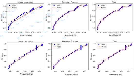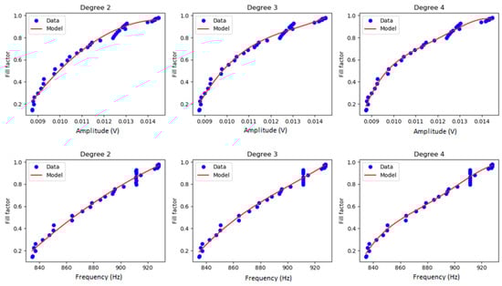 Table 3 shows the MSEs obtained with the different regression techniques. We observed that in this case, the polynomial regression obtained the best results for the prediction of the fill-factor (with degree four in the bidimensional problem, with degree two for amplitude, and with degree three for frequency).