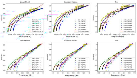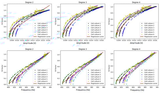 Figure 4 and Figure 5 show the visual results of the model that predicts the fill-factor against the frequency and amplitude of the circuit signal using the different algorithms and the original samples for myoblast cell cultures. As we can observe, there is a high variance among them for small values of the fill-factor. Figure 4 shows the results of polynomial regression using different degrees, and Figure 5, the results using linear regression, RTs, and GPs.