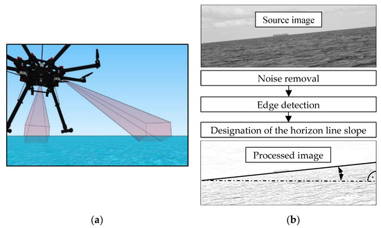 The idea of measuring the horizon line slope: (a) Recording images with a two-camera tilt compensator mounted on a UAV; (b) The image processing process for the slope angle.