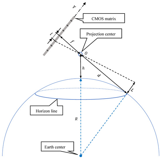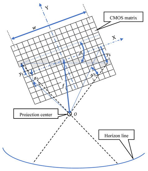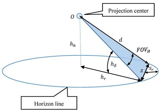 In Equation (7) it was assumed that the part of the horizon line (with the length ) in the horizontal field of view of the camera () has the shape of a line, not an arc (Figure 4).