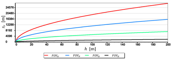 It was decided to simplify it because (as already shown in Figure 2) only the extreme pixels of the matrix (which are also boundary ) are used to calculate the horizon line slope . However, it should be realized that even for low AUV flight altitudes, but large values of horizon sagitta can be significant. Figure 5 presents the graphs of the horizon sagitta for several selected as a function of the height of the camera a.s.l. . Calculation were performed using the following relation: