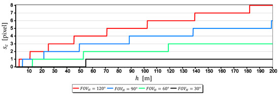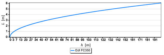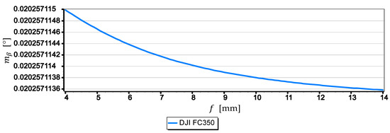 The graph in Figure 9 shows that to obtain a higher single-pixel measurement resolution of the horizon line, the focal length should be increased. Therefore, the focal length measurement resolution of 4 mm for the DJI FC350 camera (see Figure 8) taken to the previous calculations was incorrect and resulted in the lowest measurement resolution. Thus, to show the essence of the indicated problem, Figure 10 presents a graph of the single-pixel measurement resolution of the horizon line taken with a DJI FC350 camera, but at a maximum focal length setting of = 14 mm.