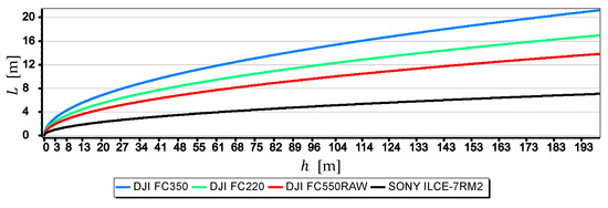 Four different cameras mounted on UAVs manufactured by DJI were evaluated. They were chosen primarily because they differ in optical parameters, including focal lengths as well as matrix sizes and resolutions. Their most important technical parameters taken in the calculations into account are presented in Table 1.
