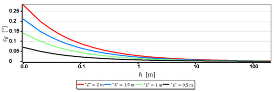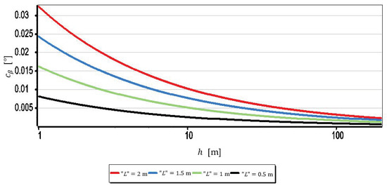 The results set out in Table 2 show that the measurements of the horizon slope can be performed with a resolution of 0.02°. Nevertheless, it should be remembered that the horizon is almost always distorted at the contact with the sea by rippling the water surface. Therefore, increasing the single-pixel measurement resolution to values smaller than the height of the sea waves certainly will not increase the measurement resolution of the horizon slop . Therefore, it is reasonable to check at which values of and , sea waving should be included in the computations. The dependence (9) can be easily used for this purpose. It should only be assumed that the value corresponds to the height of the sea waves-further referred to as . The result of calculations obtained at that time can be treated as the horizon slope measurement resolution–further referred to as , depending on and the wave height . Figure 11, Figure 12, Figure 13 and Figure 14 presents charts for four arbitrarily selected wave heights equal: 0.5 m, 1 m, 1.5 m and 2 m (corresponding to sea states 2–4 of the Douglas Sea Scale [26]).