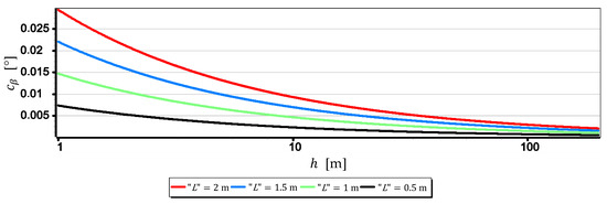 When comparing the values in Table 2 with the values shown in Figure 11, Figure 12, Figure 13 and Figure 14, it can be stated that may be greater than . Therefore, when talking about the actual measurement resolution of the horizon slop using a camera, for small and for large should be used. Table 3 presents the threshold values of height above which should be used instead of .