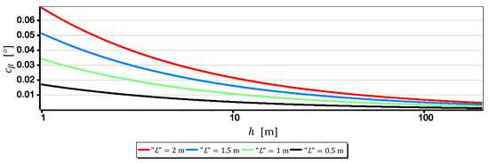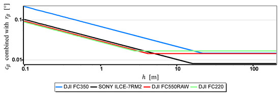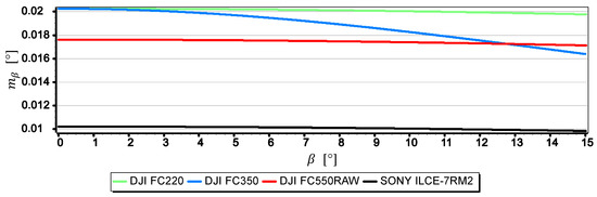 Based on the graphs presented in Figure 20, a generalized conclusion can be formulated that the accuracy of measuring the focal length has a large impact on the value of . In the case of DJI FC550RAW, DJI FC350 for μm the value increases significantly reaching 0.027°. However, the results of calculations presented in Table 4 for μm, and indicate that the value of increases slightly as a function of the angle β. In the case of the SONY ILCE-7RM2 camera, the value increased by only 0.0013°. In the case of SONY ILCE-7RM2 camera, the value of increased by only 0.0013°.