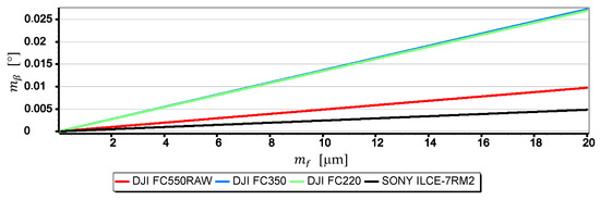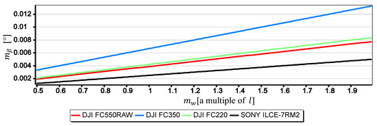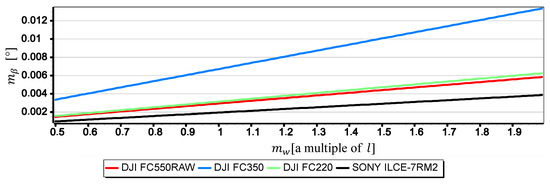 Figure 24, Figure 25 and Figure 26 present graphs of the mean error of measurement as a function of mean error of angles i measurements on CMOS matrix for the horizon slop equals . It was assumed that the values of and (calculated by Dependence (14)) are equal and correspond to their multiple in the range of . Thanks to this, as in the case of m_w, it was possible to carry out an analysis of the impact of and on using the comparative method for all the cameras simultaneously even though they have different focal lengths and matrix sizes.