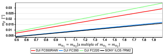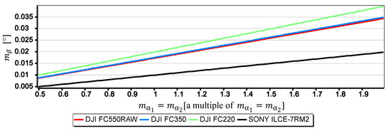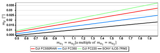 The graphs presented in Figure 21, Figure 22 and Figure 23 show that the impact of on depends to a large extent on the size of the angle being measured. With the increase of from to , the value of increases up to about 2.5 times. However, this value is still not very big-in the case of DJI FC220, DJI FC550RAW, SONY ILCE-7RM2 cameras it remains in the ranges of thousandths of a degree.