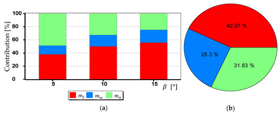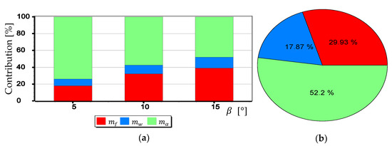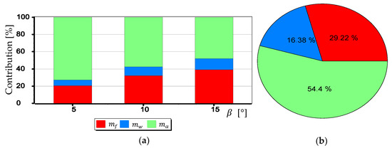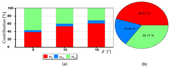 The graphs presented in Figure 24, Figure 25 and Figure 26 indicate that the influence of and on depends primarily on the size of the angle being measured. Although in this case, contrary to the case of , increasing the value of the angle β results in decreasing the value of . It should also be noted that in the case of DJI FC350 and DJI FC550RAW cameras, for the doubled value and , the calculated value of reached as much as . Figure 27, Figure 28, Figure 29 and Figure 30 present influance of on as a percentage contribution.