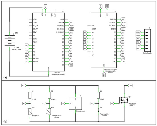 Circuit diagram of the multi-sensor monitoring system: (a) the microcontroller board and data logger shield combination and (b) the sensors. For the circuit reference designator list, see Appendix A.