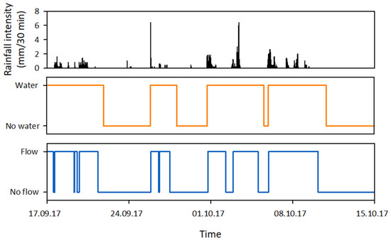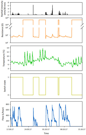 Three resistance signals of the channel wetting and drying sequence fall within the overlap range: the signal caused by rainfall puddles, the signal that indicates the dilution of stream water during rainfall events, and the signal of damp sediment on the electrodes. The first two correspond to water states and the last one to a no water state. Since the shape of the last signal is easily distinguishable from the first two, the data in the overlap range could be converted into water and no water states based on the shape of the signal. Values outside of the overlap range were converted into water and no water states using the upper and lower boundaries of the overlap range (R < 8.7 × 103 Ω = water and R > 1.7 × 104 Ω = no water).