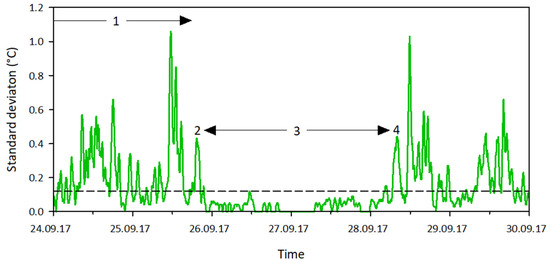 - When the channel dried up, the moving standard deviation first increased to above 0.12 °C and then peaked with a maximum of at least 0.20 °C. The timing of the peak coincided with the timing of the state change (#4 in Figure 6).