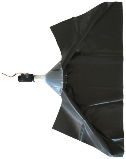 To direct water into the flow sensor, a PP funnel with a piece of tarp attached to the funnel mouth was connected to the flow sensor (Figure 8). The funnel (length 200 mm, mouth diameter 220 mm, neck diameter 45 mm) was flattened on one side (after placing it in a hot air oven) to allow it to be positioned flat on the channel bed. The funnel mouth was covered with polyethylene (PE) mesh (mesh size 3×3 mm) to prevent coarse sediment from entering the valve body and blocking the impeller. The tarp (length 40 cm, width 100 cm) is a flexible extension of the funnel, which can cover (most of) the wetted perimeter of small channels (see Section 3.2 for more details on the field setup of the flow sensor). In the case of high flows, water not only flows through but also over the funnel. However, since the sensor is used to provide information on flow/no-flow states and not on the actual discharge, this is not an issue.