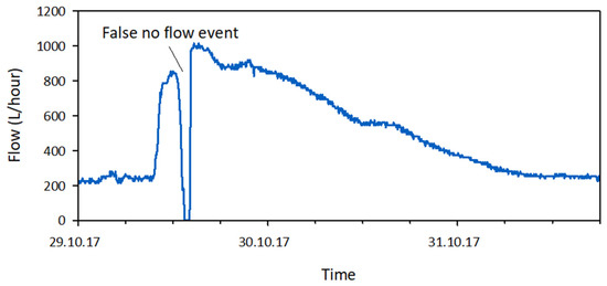 The raw discharge data (Figure 3) was converted into state data (Figure 4) using a simple threshold filter. Discharge values higher than zero were assigned a flow state and discharge values of zero were assigned a no-flow state. At some monitoring locations on the field test site, the funnel of the flow sensor temporarily got clogged during peak flow conditions for some of the largest events. This resulted in ‘gaps’ in the data with discharge values of zero (Figure 9). These false no-flow events were filtered from the discharge data based on the shape of the signal and assigned a flow state.