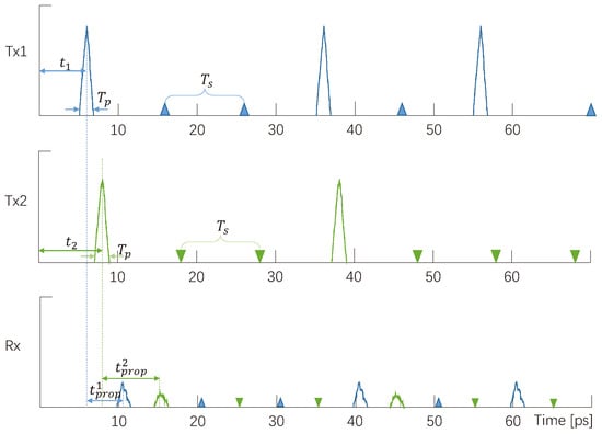In TS-OOK, when a nano-node needs to send a packet, the logical “1” in the packet is modulated as a femto-second-long pulse, logical “0” is modulated as silence. As shown in Figure 1, there are two transmitting nano-nodes, and , sending packets to the receiver simultaneously. The sequence sent by is “1001010” and the sequence sent by is “1001000”. Due to the high spreading loss and molecular absorption loss, the received pulse power would be much smaller than the transmitting power. The time interval between two symbols named symbol duration is fixed so that every nano-node and nano-controller can sync to demodulate the signals. is much longer than the pulse duration , so that the receiver can have enough time to diminish the effects of noise and interference, and detects signals. Moreover, since is much longer than , the receiver does not need to listen to the channel all the time, i.e., it can receive signals from other nano-nodes after receiving the pulse.