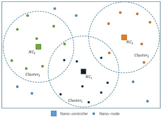 In general, the structures of nano-networks can be divided into two types, namely centralized and distributed nano-networks. In centralized nano-networks, there are two basic kinds of nano-devices, i.e., nano-node and nano-controller. Nano-nodes are responsible for collecting data from the environment and send the data to their closest nano-controller. All the nano-nodes are equipped with energy harvesting units, which can capture energy from the environment. More details of energy harvesting systems can be found in [12,25,26,27]. Nano-controllers are not selected from nano-nodes. Nano-controllers are fixed in the networks and have enough power to manage a number of nano-nodes within its coverage, and can send the collected data to nano-gateways or macro networks. An example of centralized nano-network is presented in Figure 2. There are three nano-controllers dominating three clusters of the network.