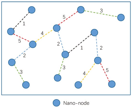In distributed nano-networks, communications between nano-nodes are self-organized. Nano-nodes make decisions by their own and cooperate with their neighboring nano-nodes within transmission range. Figure 3 presents an example of distributed nano-network. Due to the self-organized communication scheme adopted by the nano-nodes, communications among nano-nodes may occur at different time. The numbers in the figure represent the time of different communications.