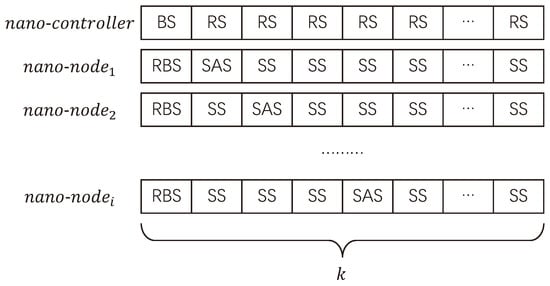 where is the number of SAS, is the unique identification of nano-node, and refers to the modulus operation. As the example in Figure 4 shows, the first time slot of each nano-node is RBS, the second time slot of nano- is SAS, and the third time slot of nano- is SAS. k is the number of time slots that a time frame can be divided into which can be obtained as follows:
