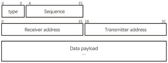 Due to the peculiarities of SSA-MAC, the format of the packets should be redesigned. In the SSA-MAC, the data packet can be classified into broadcast data packet and unicast data packet. The broadcast data packet is sent by the nano-controller and is used for information and function updating, and time synchronization, etc. The unicast data packet is used for delivering collected data information. The packet format of data packet is present in Figure 6, where refers to the type of data packet, “0001” represents the broadcast data packet and “0010” represents the unicast data packet. The is the sequence number of packets and occupies 12 bits. The address of receiver and transmitter occupy 16 bits, respectively.