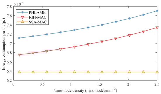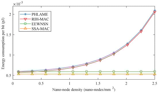 (iii) When nano-node density is small (less than 0.5 nano-nodes ), the order of energy consumption per bit of the four MAC protocols is PHLAME > EEWNSN > RIH-MAC > SSA-MAC. The reason PHLAME has the highest energy consumption per bit is that the nano-nodes will check the availability and exchange symbol rates with the receiving nano-nodes by handshake process before transmitting the packets, which needs extra energy and could introduce more collisions. The reasons the energy consumption per bit of EEWNSN is larger than RIH-MAC are that, on the one hand, the nano-nodes need to communicate with the nano-controllers to allocate the transmitting time slot in EEWNSN, which needs extra energy, and, on the other hand, when the nano-node density is small, the collisions among nano-nodes are not strong in RIH-MAC. However, in SSA-MAC, nano-nodes do not need handshake with other nano-nodes or communicate with the nano-controller to allocate time slot. In addition, nano-nodes can transmit data packets during their own time slots. Therefore, it has the lowest energy consumption per bit.