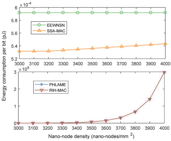 In fact, according to Equations (3), (6) and (7), a time frame can be divided into tens of thousands of time slots. Hence, nano-nodes in SSA-MAC can still maintain a good performance when nano-node density is very large. The performance of different protocols with much higher nano-node density is investigated in Figure 8, where the nano-node density is set from 3000 to 4000 nano-nodes/, i.e., the number of nano-nodes is up to one million. It can be observed that the energy consumption per bit of PHLAME and RIH-MAC is much higher than EEWNSN and SSA-MAC. Comparing Figure 7 and Figure 8, the EEWNSN and SSA-MAC can still maintain good performance when nano-node density is very large, since nano-nodes in these two protocols can transmit in their own time slots. The proposed SSA-MAC performs better than EEWNSN, since it does not need to communicate with the nano-controller to allocate time slots. However, when nano-node density exceeds 3200 nano-nodes/, the energy consumption per bit of SSA-MAC increase with the node density. Since, in this simulation, a time frame can only be divided into one million time slots according to Equations (3), (6) and (7), some nano-nodes have to transmit in the same slot, which results in collisions. Nevertheless, we can enlarge the length of time frame to eliminate the collisions.
