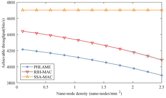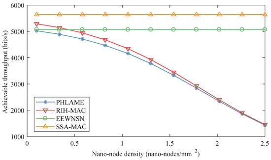 The achievable throughput of different MAC protocols as a function of nano-node density in centralized nano-networks is presented in Figure 9. In these simulations, energy harvesting speed was set to 3 pJ/s. The achievable throughputs of PHLAME and RIH-MAC decrease drastically with nano-node density, e.g., the achievable throughput when nano-node density is 2.5 nano-nodes/ is only when density is 0.5 nano-nodes/. The reason is that the collision probabilities of the two protocols increase with nano-node density according to Equation (10). However, the achievable throughputs of EEWNSN and SSA-MAC do not change much when the nano-node density increases. In EEWNSN, the nano-nodes can communicate with the nano-controller to allocate their own transmitting time slot. In SSA-MAC, a time frame will be divided into several time slots by the number of nano-nodes and peculiarities of TS-OOK, where nano-nodes can transmit/receive in their own time slot allocated by their ID. Therefore, collisions in these two protocols seldom happen according to Equation (10), i.e., nano-nodes do not need to cost extra resources to retransmit the packet, and can maintain a good performance. The achievable throughput of SSA-MAC is higher than EEWNSN, because the nano-nodes in the SSA-MAC do not need to communicate with the nano-controller to allocate the transmitting time slot. Comparing Figure 7 and Figure 9, it can be observed that the achievable throughput of nano-node is negatively correlated with energy consumption per bit. That is, the achievable throughput of nano-node is mainly decided by the energy harvesting speed. Therefore, to design more advanced energy harvesting systems and more energy-efficient communication protocols are the keys to improve the performance of nano-networks.
